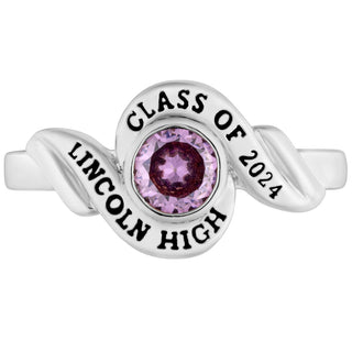 Ladies' Sterling Silver Swirl Bypass Round Birthstone Class Ring