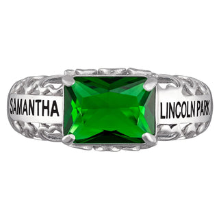Sterling Silver Emerald-cut Birthstone Class Ring With Filigree Hidden Year
