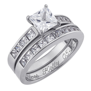 Sterling Silver Square CZ 2 Piece Engraved Wedding Ring Set