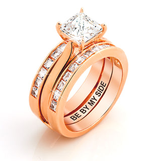 Rose Gold over Sterling Square White Topaz Engraved Enhancer Engagement Ring Set