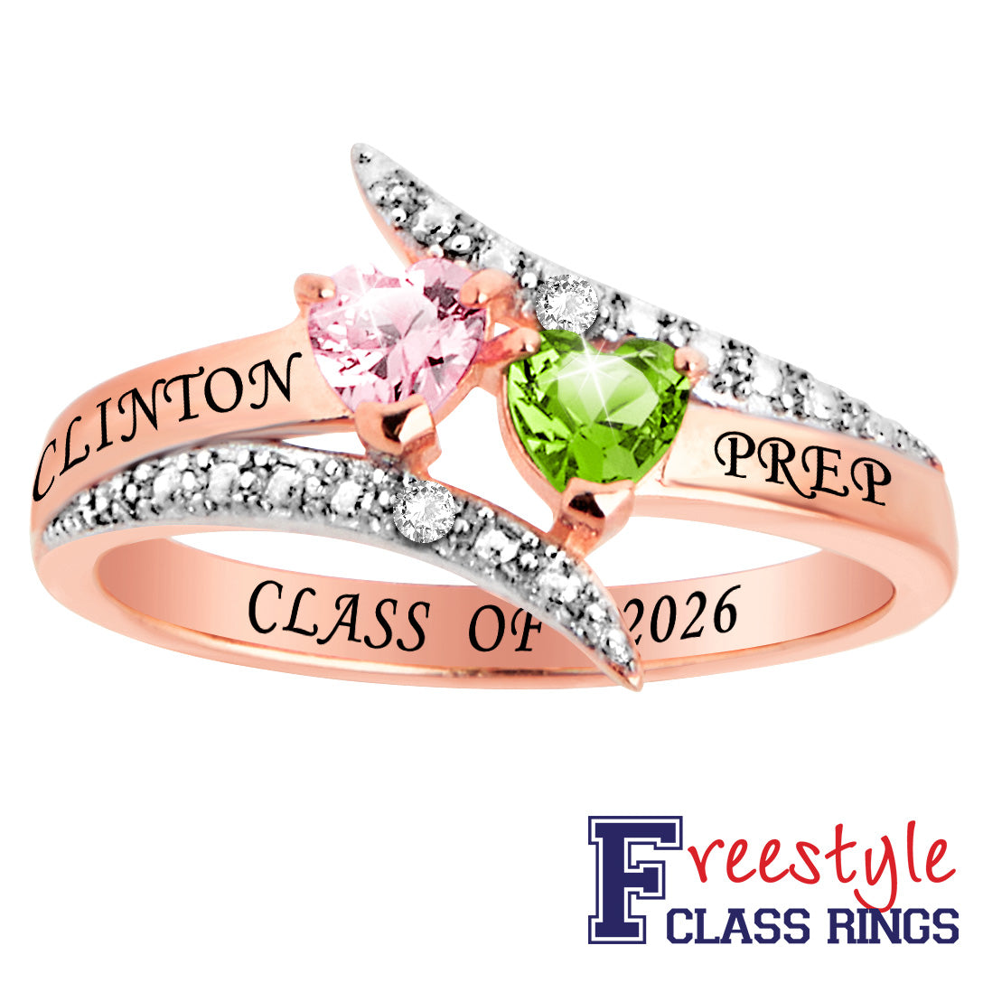 Accept your diploma in style wearing this elegant class ring! Two heart-shaped birthstones are nestled into this Gold over Sterling design that is accented with Genuine Diamonds, providing plenty of sparkle. Choose your birth month, school colors or favorite hues for the birthstones. Complete this keepsake ring by adding your name and class year alongside the hearts and including a private message on the inside band. A perfect gift idea for a special graduate in your life.