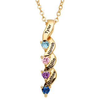 Give her a gift she's sure to love all year long. Featured in our From the Heart Collection, this necklace features a cascading design with heart-shaped birthstones below each swirl, with an engraved with a name of your choice on each swirl. Select from 2 to 4 birthstones and names. Available in shimmering Silver, glistening Gold or lustrous Rose Gold. A great gift for yourself or a loved one for any holiday! <