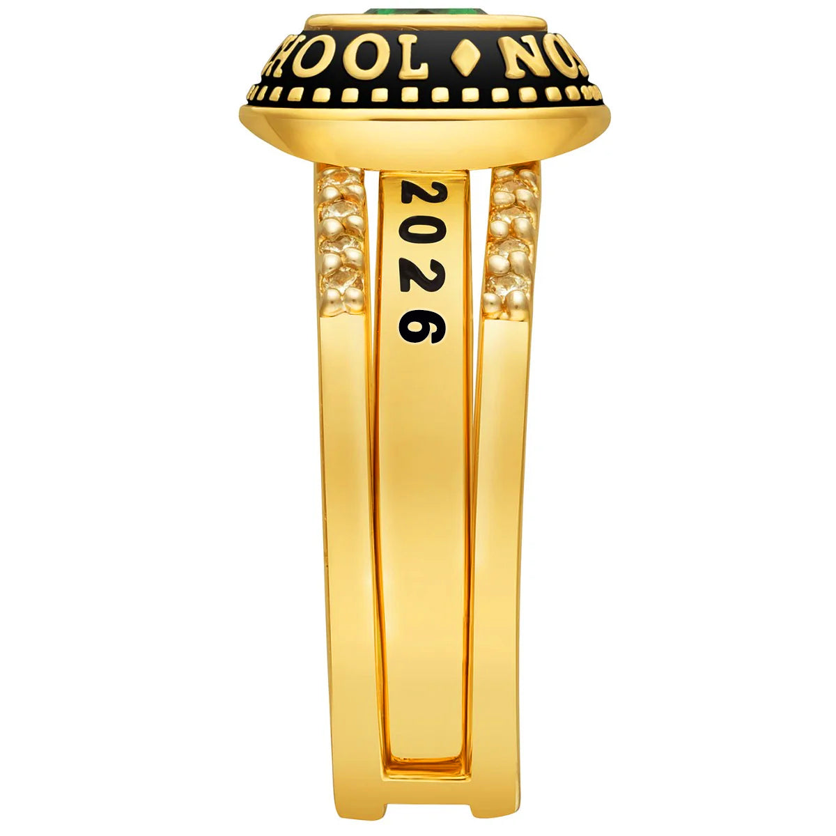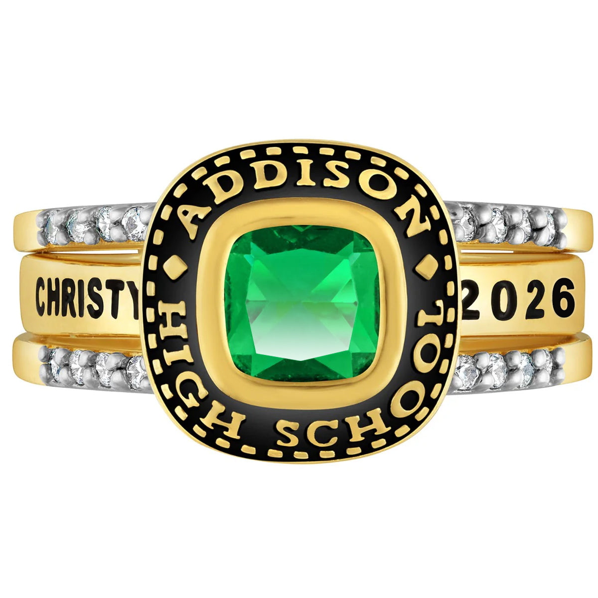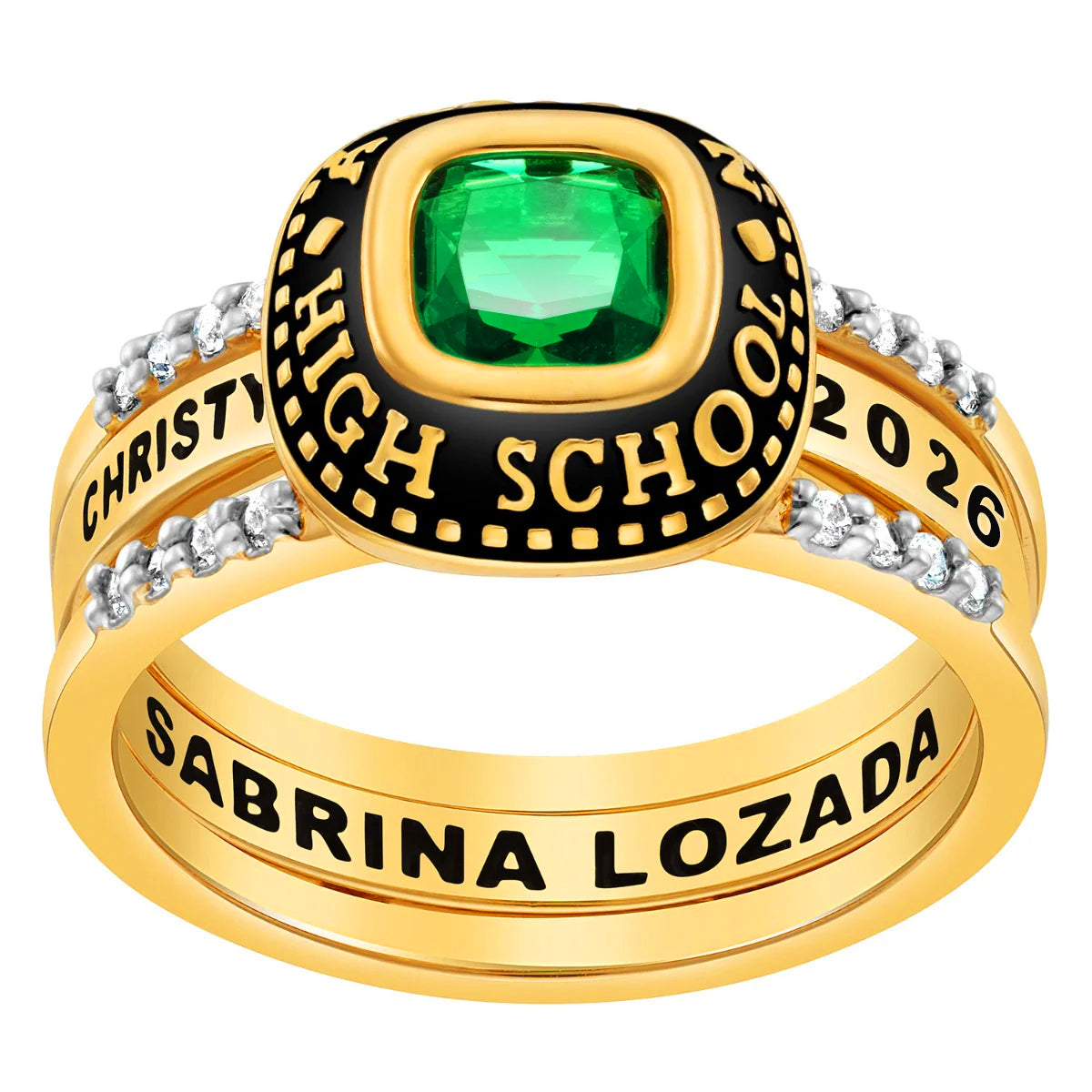 Pep rallies, spring musicals and homecoming. Keep your favorite high school memories alive with this beautiful class ring. This gold plated design includes a jacket and cubic zirconia accents. Customize with a center stone representing your birth month or school color. Finish personalizing with your name, school and graduation date for a one of a kind keepsake.