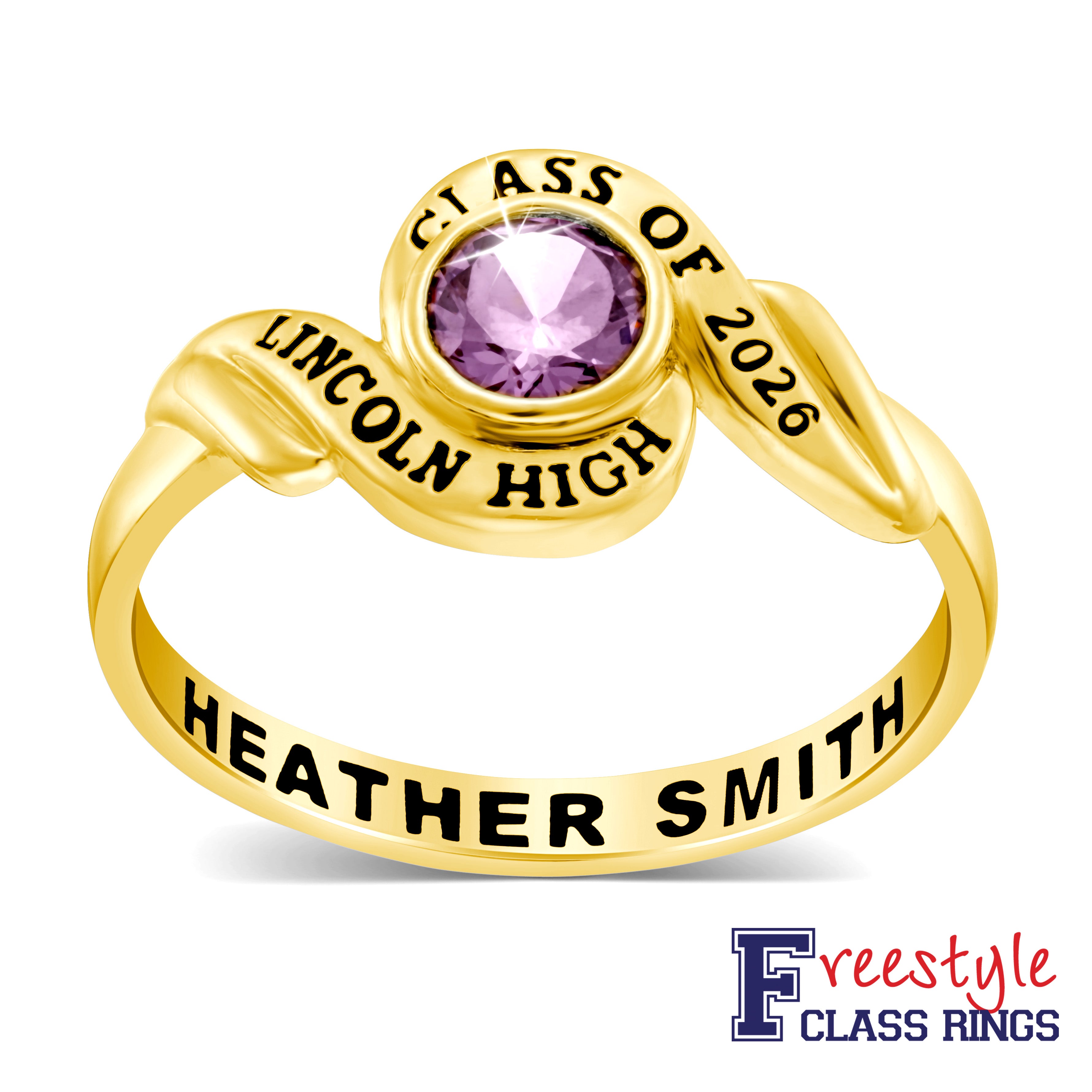 Show your school pride with this elegant class ring. The round birthstone is nestled within the swirl design featuring school name and class year. Complete with a special message along the inside of this stunning ring. This will be a treasured keepsake for years!