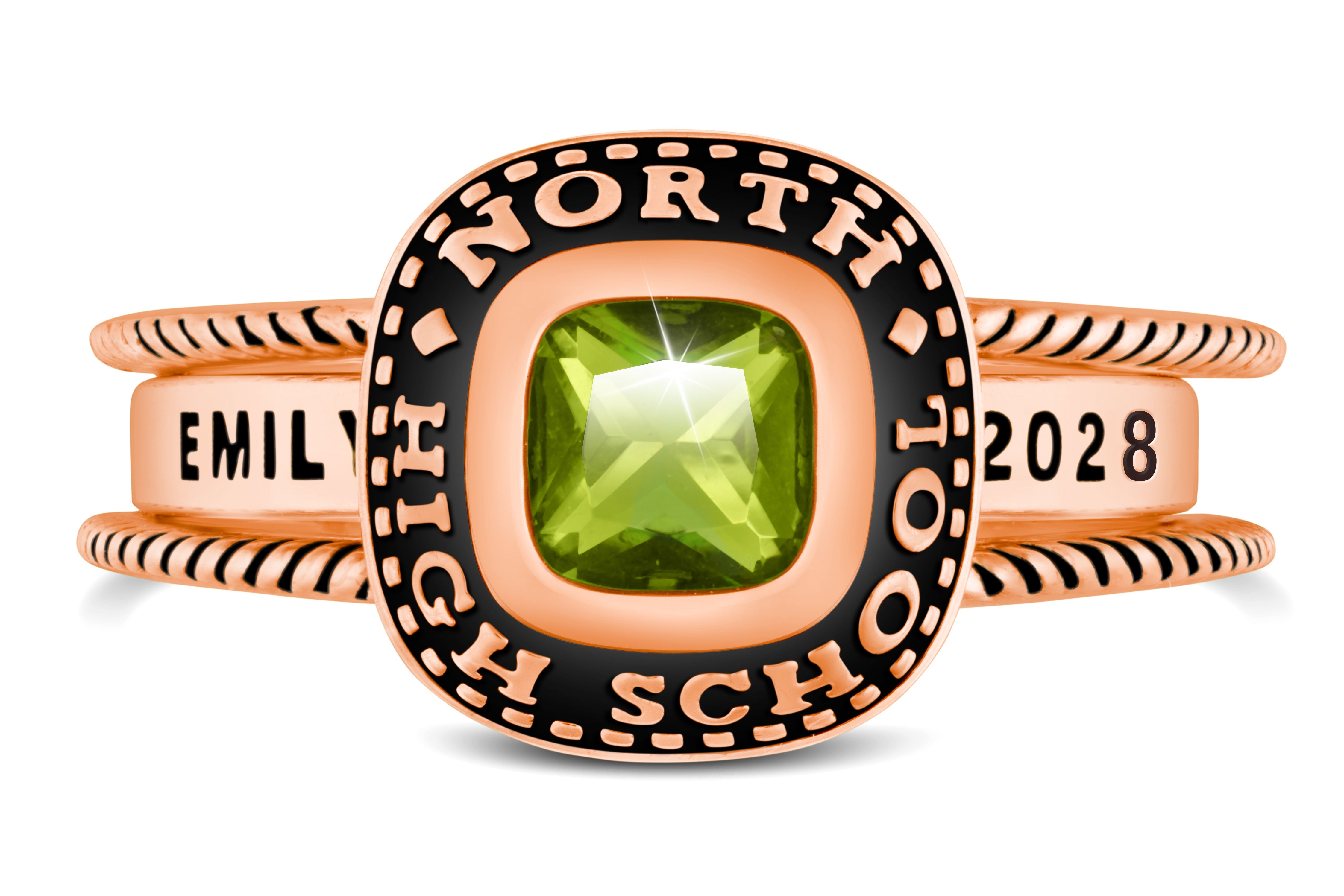Celebrate her high school accomplishments with this lovely rose gold plated class ring! This design includes a jacket and numerous ways to customize. Select the center stone from her birthstone, favorite color or school color. Add her name, school name and graduation date. Even engrave a special message on the inside of the ring. She'll treasure this personal gift for years to come.