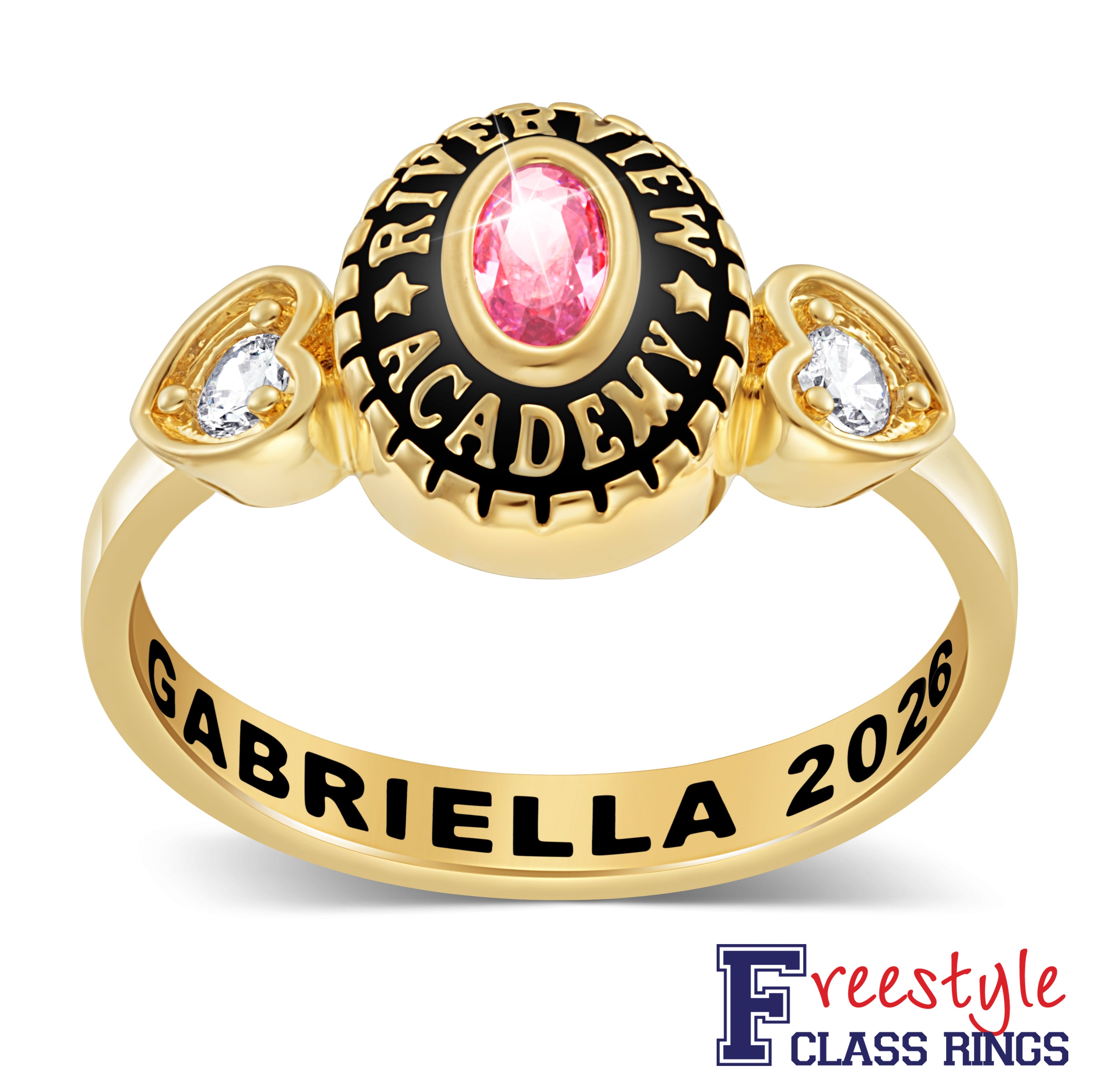 For the sweetest graduate ever, this little honey of a class ring holds her birthstone at center with flawless CZs sparkling from twin hearts. It's got special pizzazz just like your girl! The fully personalized setting is beautifully crafted in Sterling Silver layered in rich 18K Gold. So special!Specify birthstone or school color and school name (22 characters total). Personalize with an engraved message up to 18 letters and spaces inside the band. Available in full sizes, 5 thru 12.