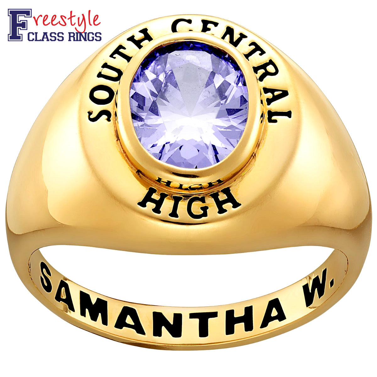 Make her senior year special with this pretty class ring! She'll love the understated elegance of the oval shaped birthstone and school name engraved in 14k Gold over Sterling. Add a personal message of congratulations along the inside band. She will wear her school ring to prom, graduation and for many years to come.