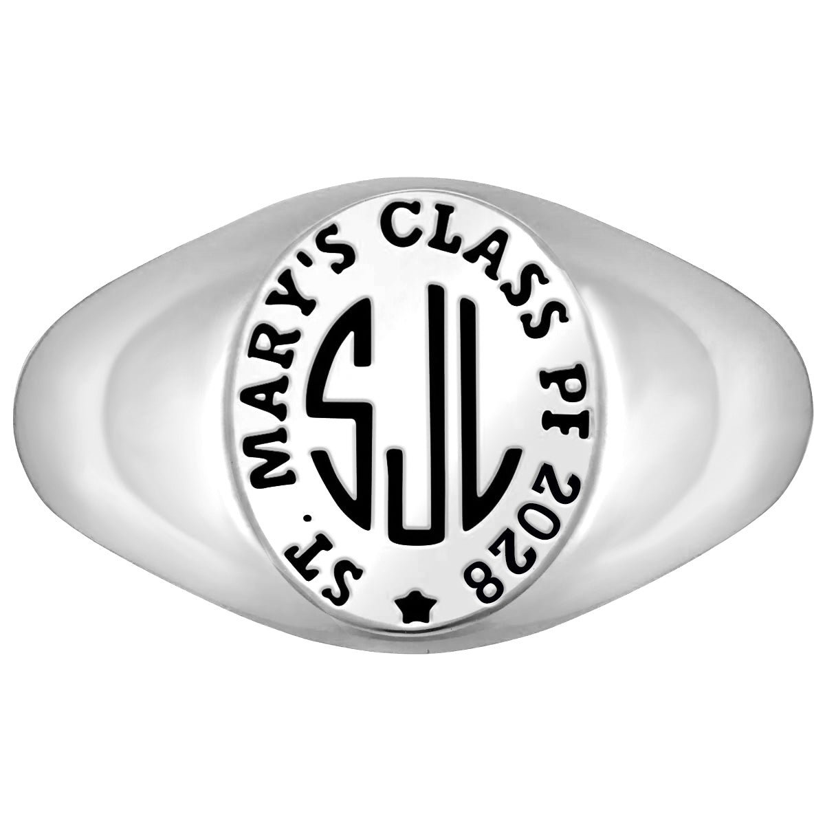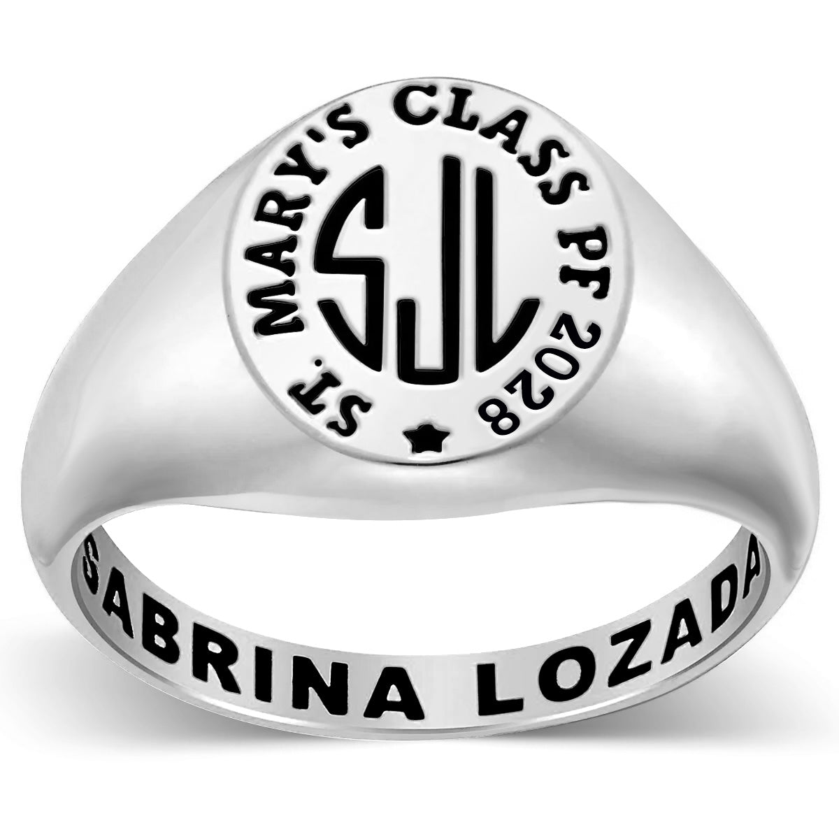Graduate in style with this cool monogram class ring! This silver signet with just your initials and school name offers a clean, modern look. Your full name or other message can be engraved inside.