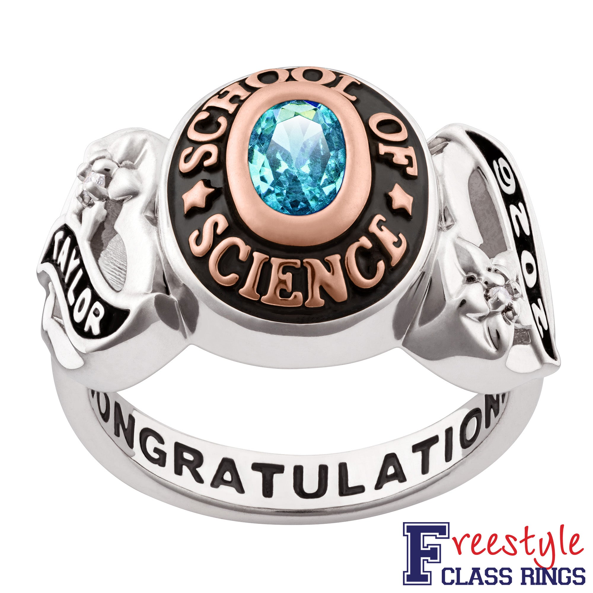 Chic and stunningly unique, this marvelous design features Rose Gold and Platinum Plating throughout! Elegantly encircling the birthstone center is space to personalize with a school name and inside the band is the engraved inscription of your choice. Add a first name, graduating year or any short text inside each heart along the sides to make this radiant class ring complete. It's perfect for the new grad or special student in your life!