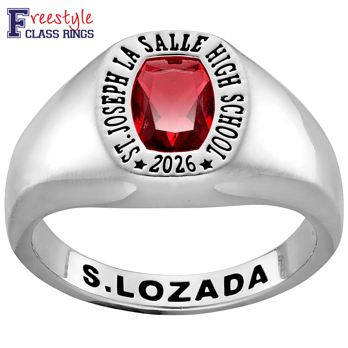 Enjoy the understated elegance of this minimal style Sterling Silver class ring. Your birthstone is showcased in sterling silver and surrounded by your school name and class year. Nothing else disrupts the clean, simple design of this school ring, save for a hidden engraving along the inside band. Wear this chic look for years to come.