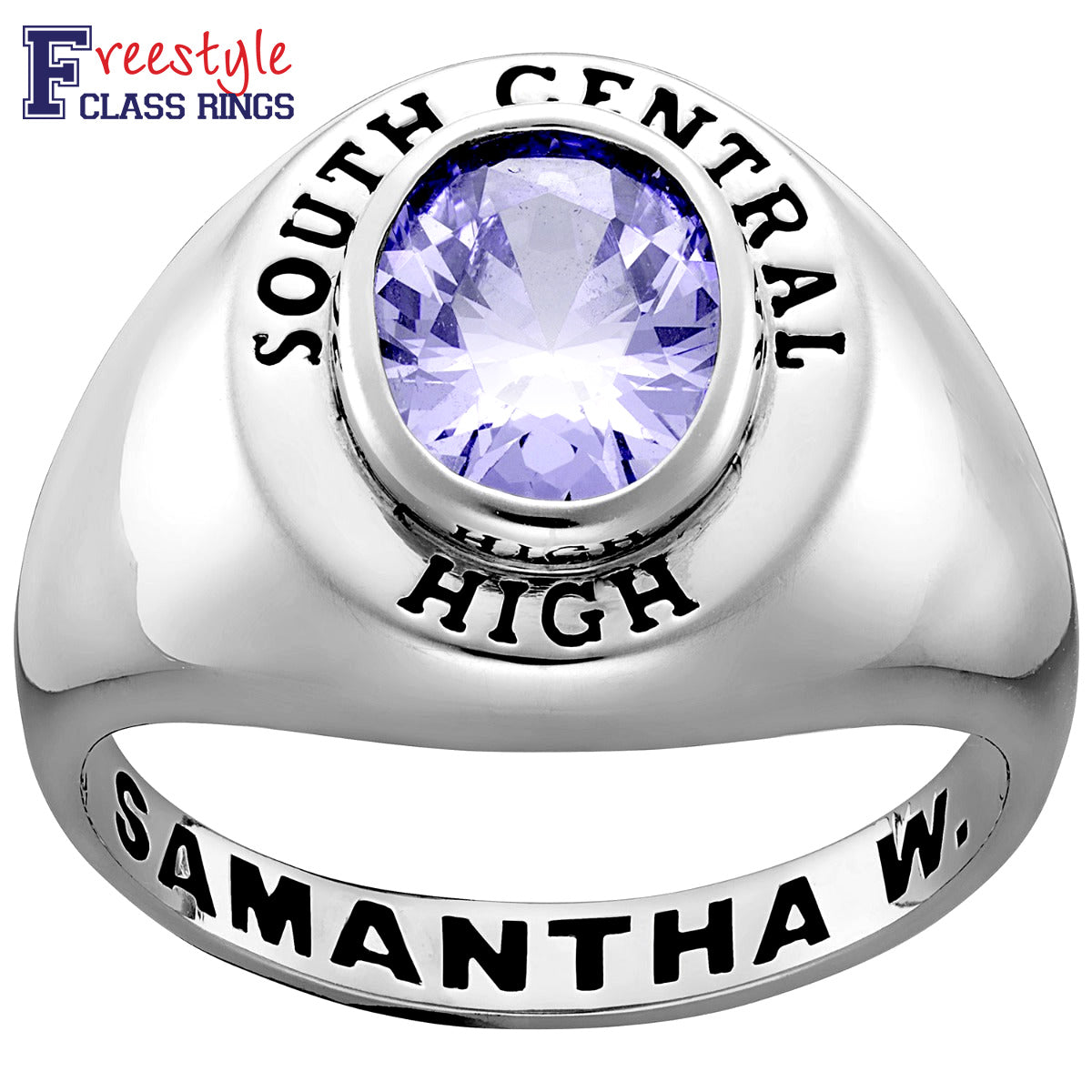 Surprise your graduate with this lovely class ring! She'll love the understated elegance of the oval shaped birthstone and school name engraved in Sterling Silver. Add a personal message of congratulations along the inside band. She'll treasure her school ring for a lifetime!
