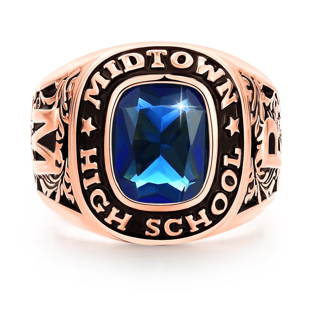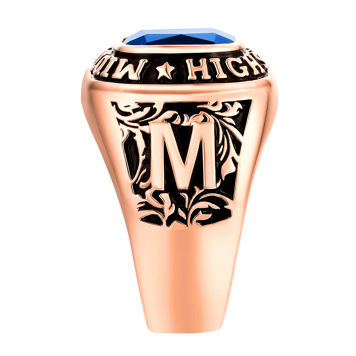 Graduate in style with this handsome class ring! Classic design showcases a birthstone surrounded by your school name and intricate custom graphics along the sides. Engrave the inside band with a school motto or meaningful quote to complete this Rose Gold plated ring that is all about you!