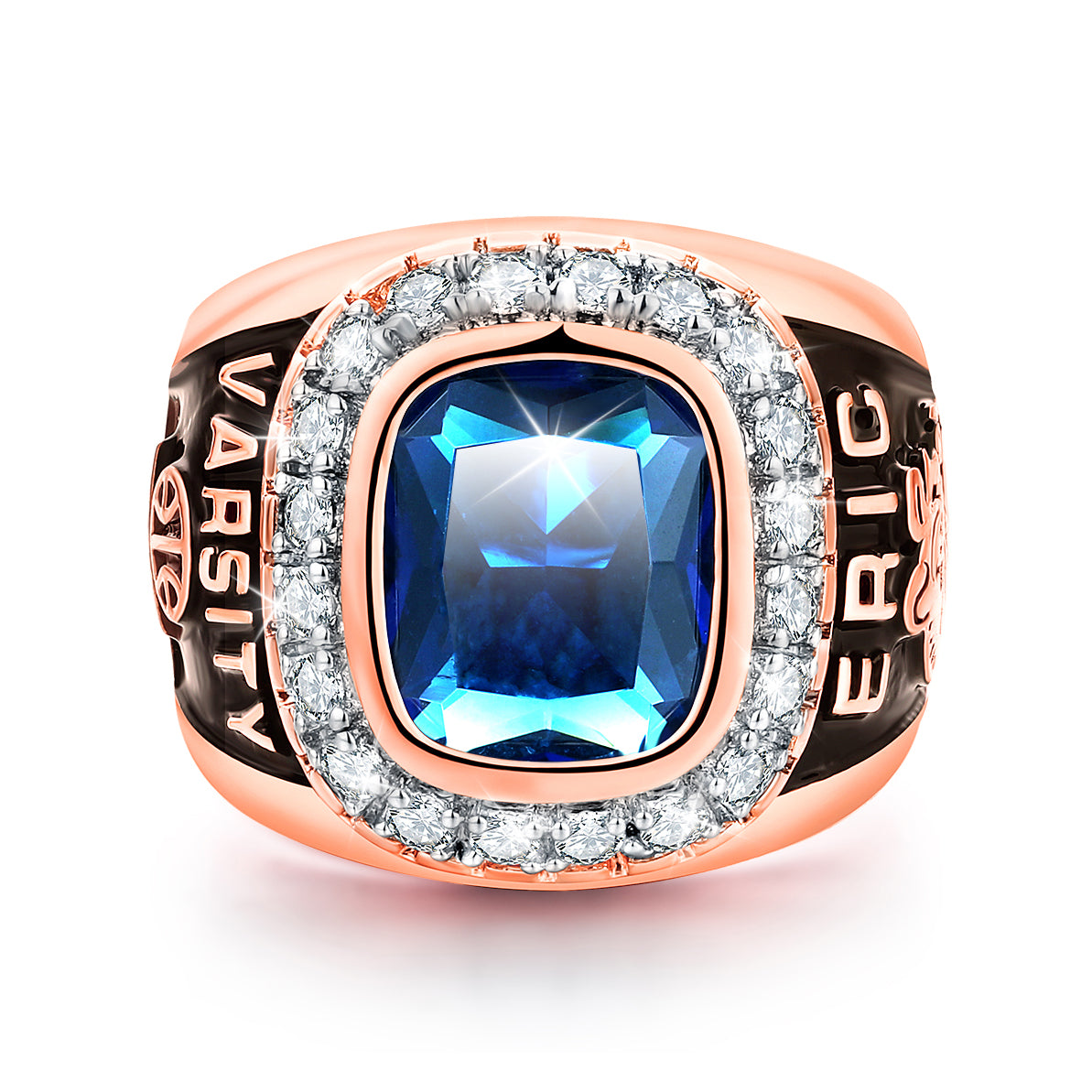 Celebrate your school accomplishments with a championship ring! This blinged out design showcases a brilliant center birthstone surrounded by dazzling CZs for a superstar look. Customize the sides with your personal stats, sports and clubs to make this stunning 14K Rose Gold plated ring your own!