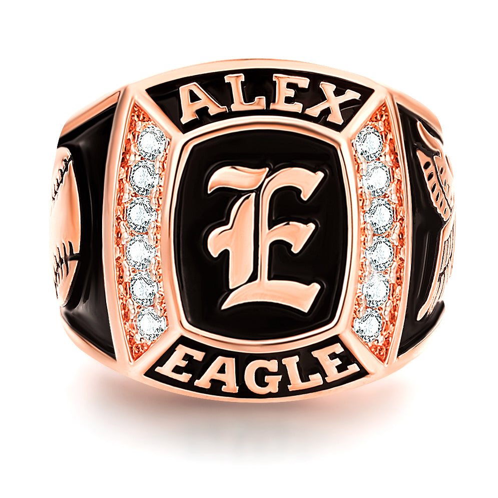 Commemorate your school days with this stylish Rose Gold plated class ring! Our design showcases your initial accented with 12 birthstones in the color of your choice. Enhance the customized look with your name, sports, clubs and other interests to create a ring completely unique to you. Include a personal quote along the inside band. This school ring is a special gift to yourself that you will always treasure.
