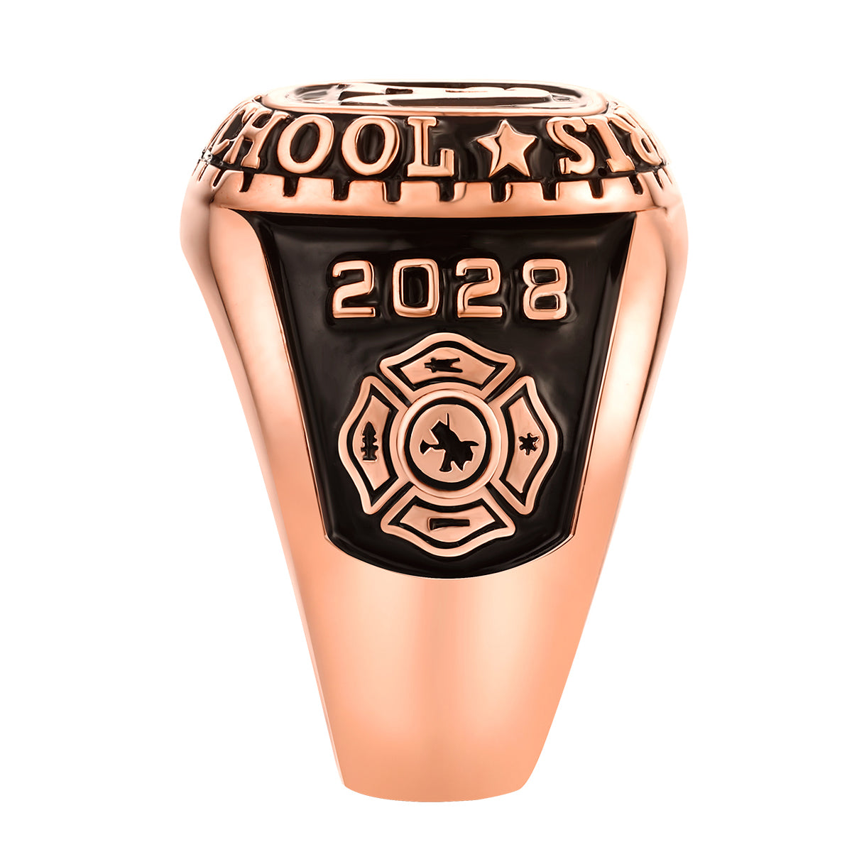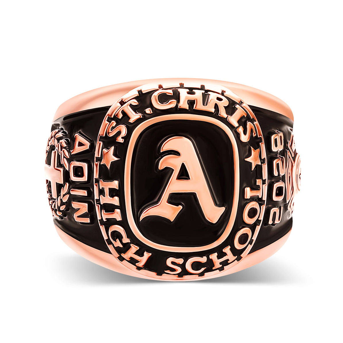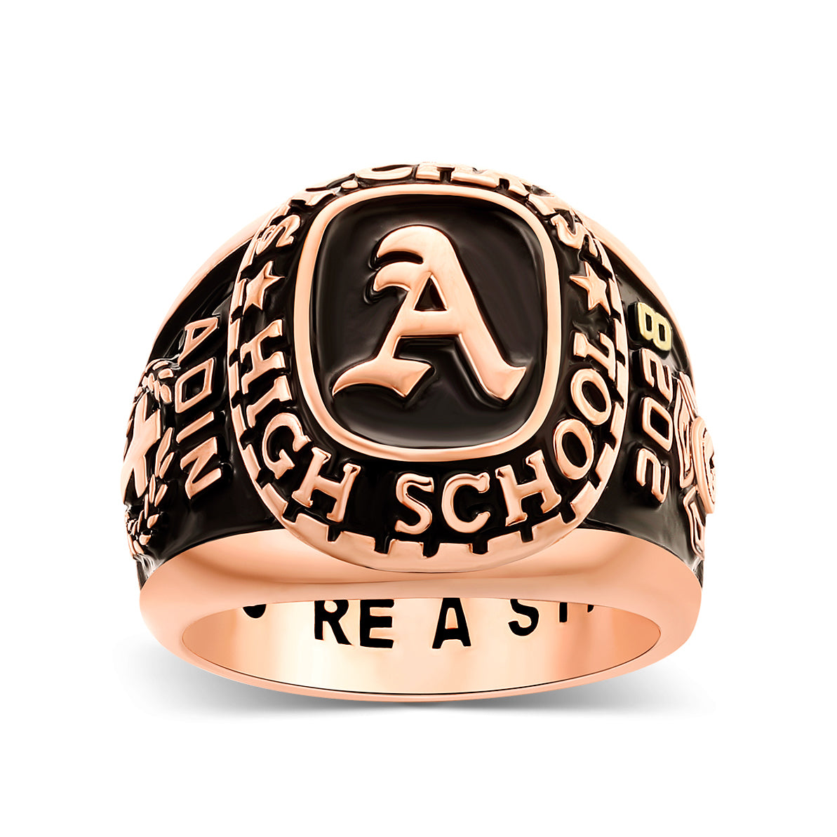 Wear a class ring as unique as you are! This stylish ring features a cool Old English initial. Choose a meaningful letter, like the first of your name or school name, to appear atop of this show-stopping Rose Gold plated ring. Personalize the sides and inner band with clubs and activities to make it one of a kind. This handsome school ring is a most thoughtful gift idea for a fashionable graduate in your life.