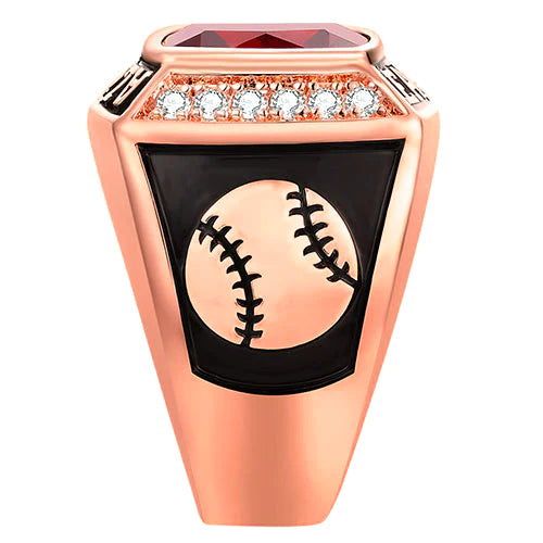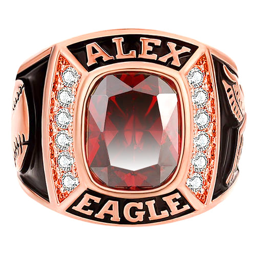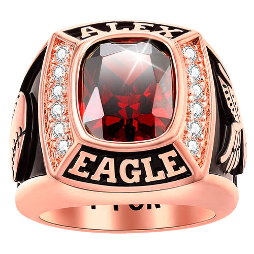 Enjoy your senior year in style with this customized class ring! Rose Gold plated design features a square center birthstone of your choice and is accented with CZ's along the sides. Personalize with clubs, sports or whatever best tells your own unique story.