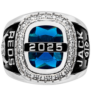 Finely crafted in Sterling Silver, this stylish class ring commemorates his graduation year or name in polished letters across the top of his birthstone. Over a dozen dazzling genuine Diamonds add a high-end look. Side panels feature your choice of images and raised polished lettering. Specify birthstone or school color stone (10 x 12 rectangle), grad year across top bridge (4 digits), and up to 9 characters to the right and left of the stone. Choose one image per side for panels (2 images total). Inscribe the inside of the band with a personalized message, up to 18 characters including spaces. Available in full and half sizes 7-14.