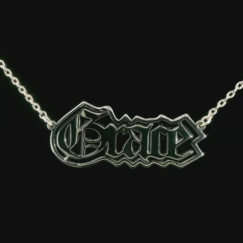 Rock an edgy look with this cool nameplate necklace! Your name, in an Old English font, is outlined in black enamel for a bold, gothic look. This necklace will look stylish when paired with your hippest wardrobe selections. Choose from warm Gold, shimmering Silver or lusterous Rose Gold.