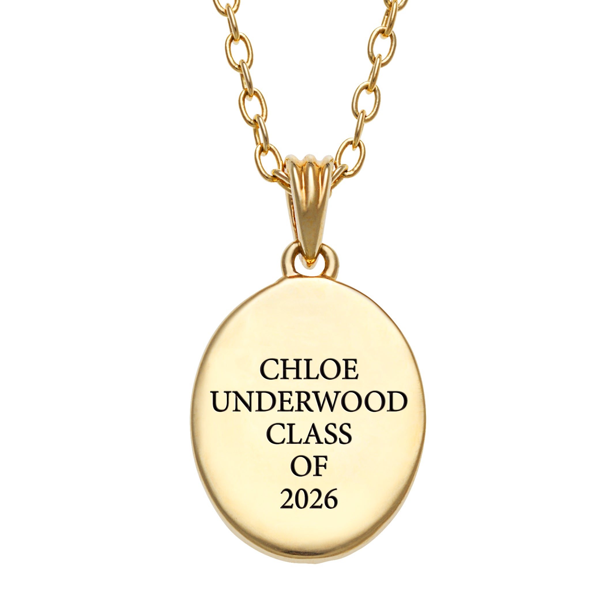 Your graduate has worked hard and deserves a special gift to commemorate their achievements and all of the wonderful memories made. Watch their face light up as they unwrap this beautiful Gold-Plated oval pendant, engraved with their name, high school and graduation year.