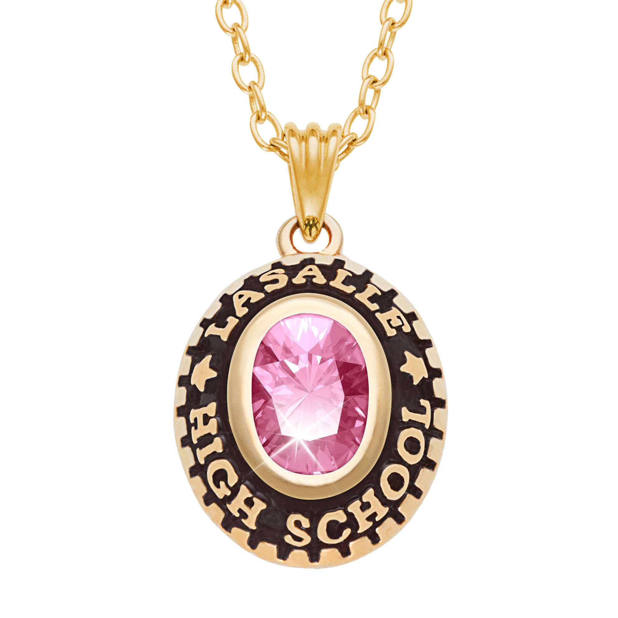 - Personalize the front of this pendant with your birthstone and school name