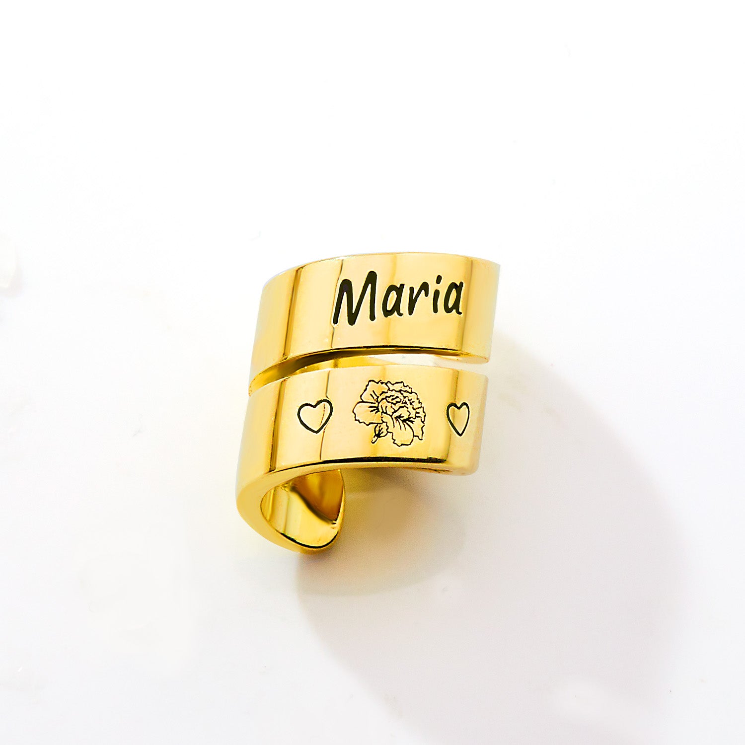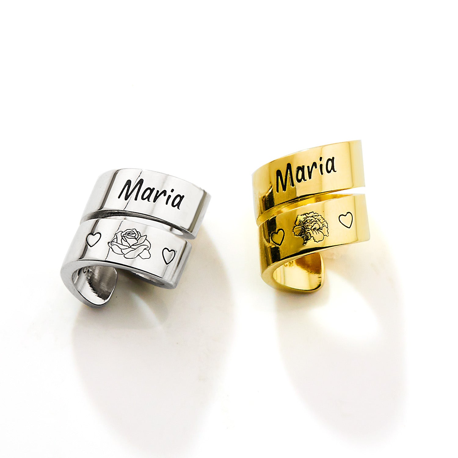 - Custom Flower Engraving – Choose from 12 beautifully detailed flowers, each flanked by a heart on either side.