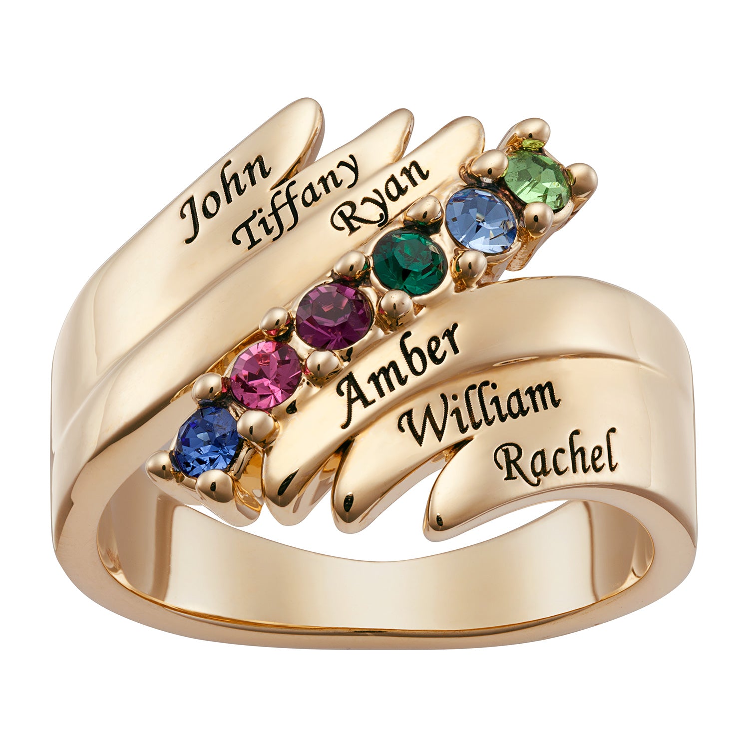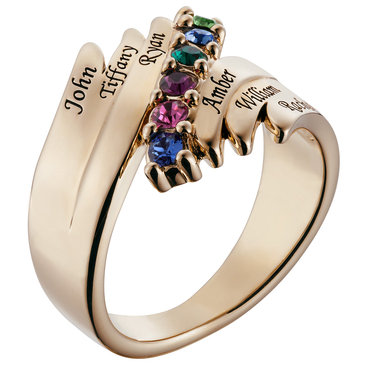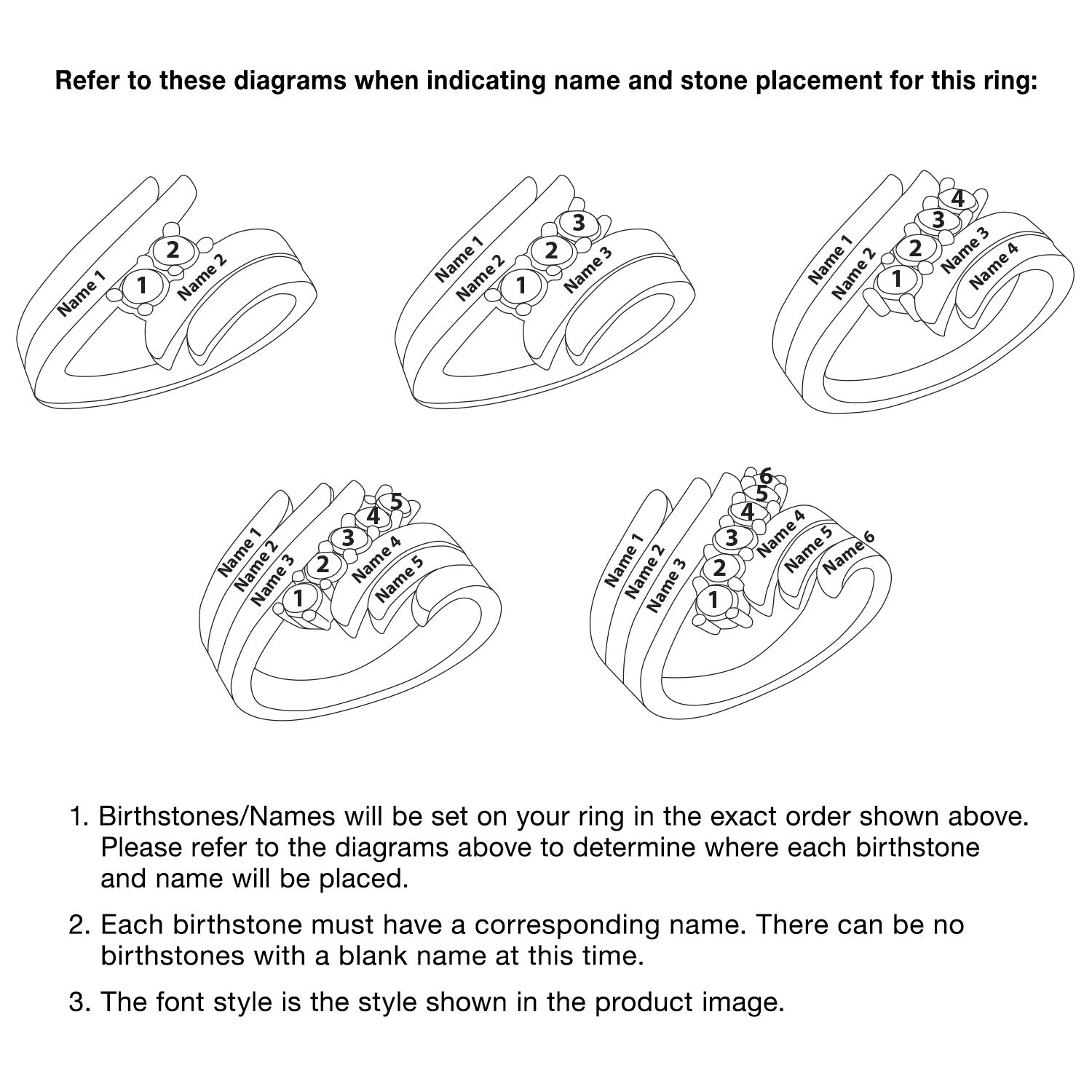 This customized Family Name and Birthstone ring includes a gold platted bypass ring that features six bands that can be personalized for Mom or Grandma. You have the option of selecting up to six Austrian crystal birthstones elegantly crafted for each. The ring can be made exclusively for her by engraving their names of up to nine characters in a script font that makes for an extravagant design.