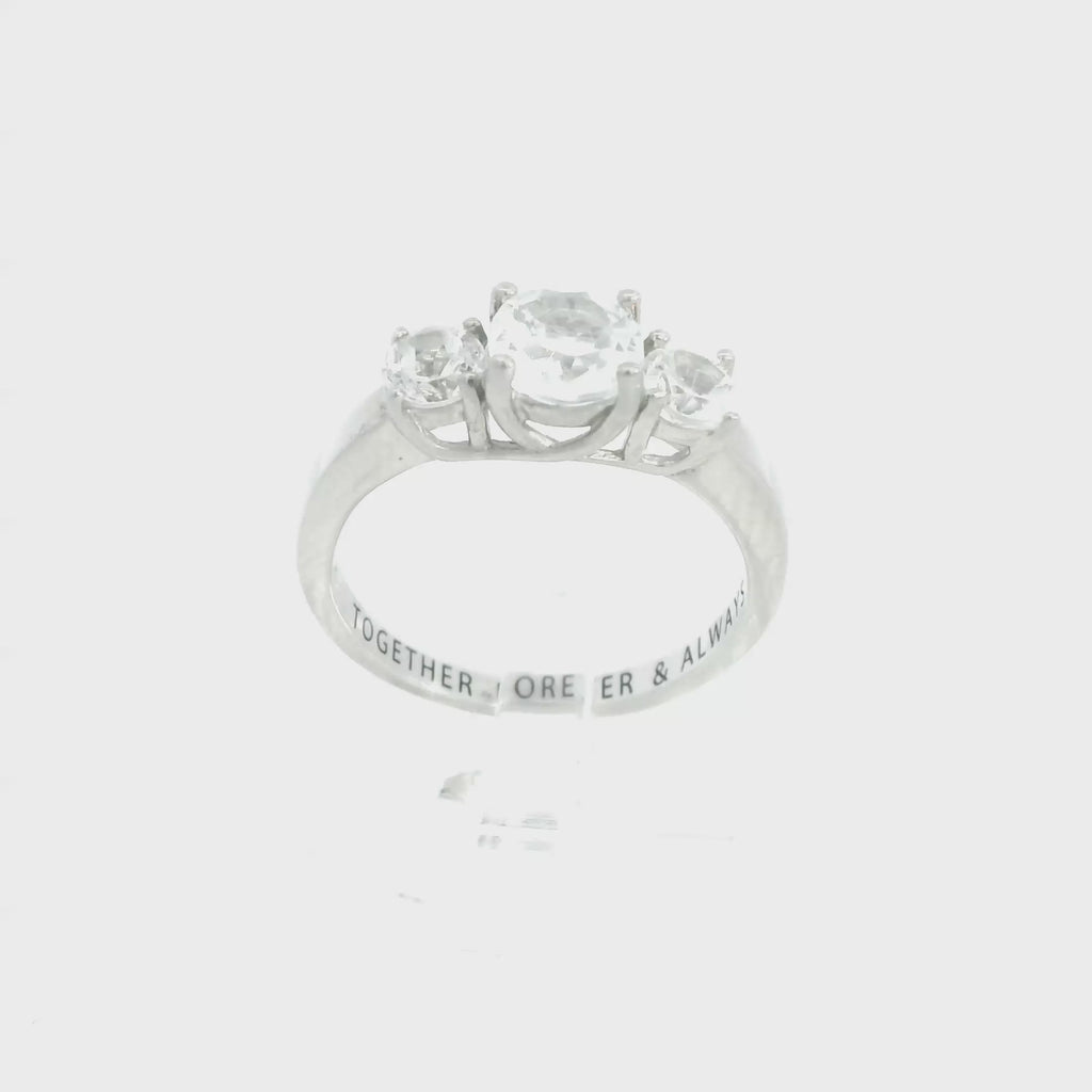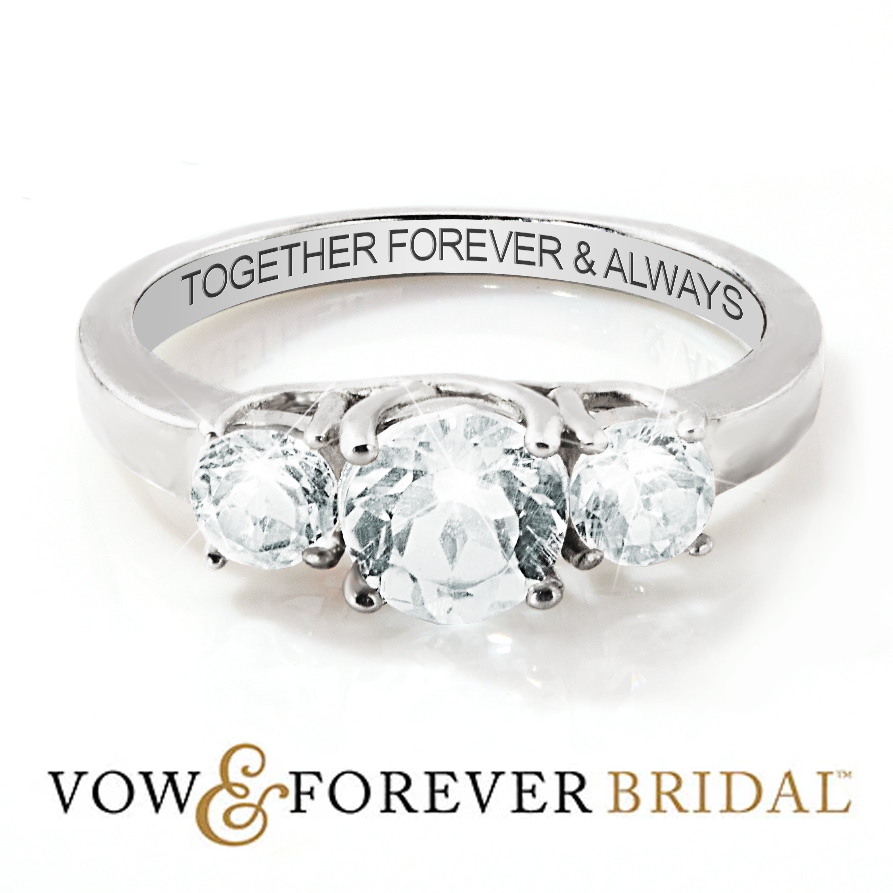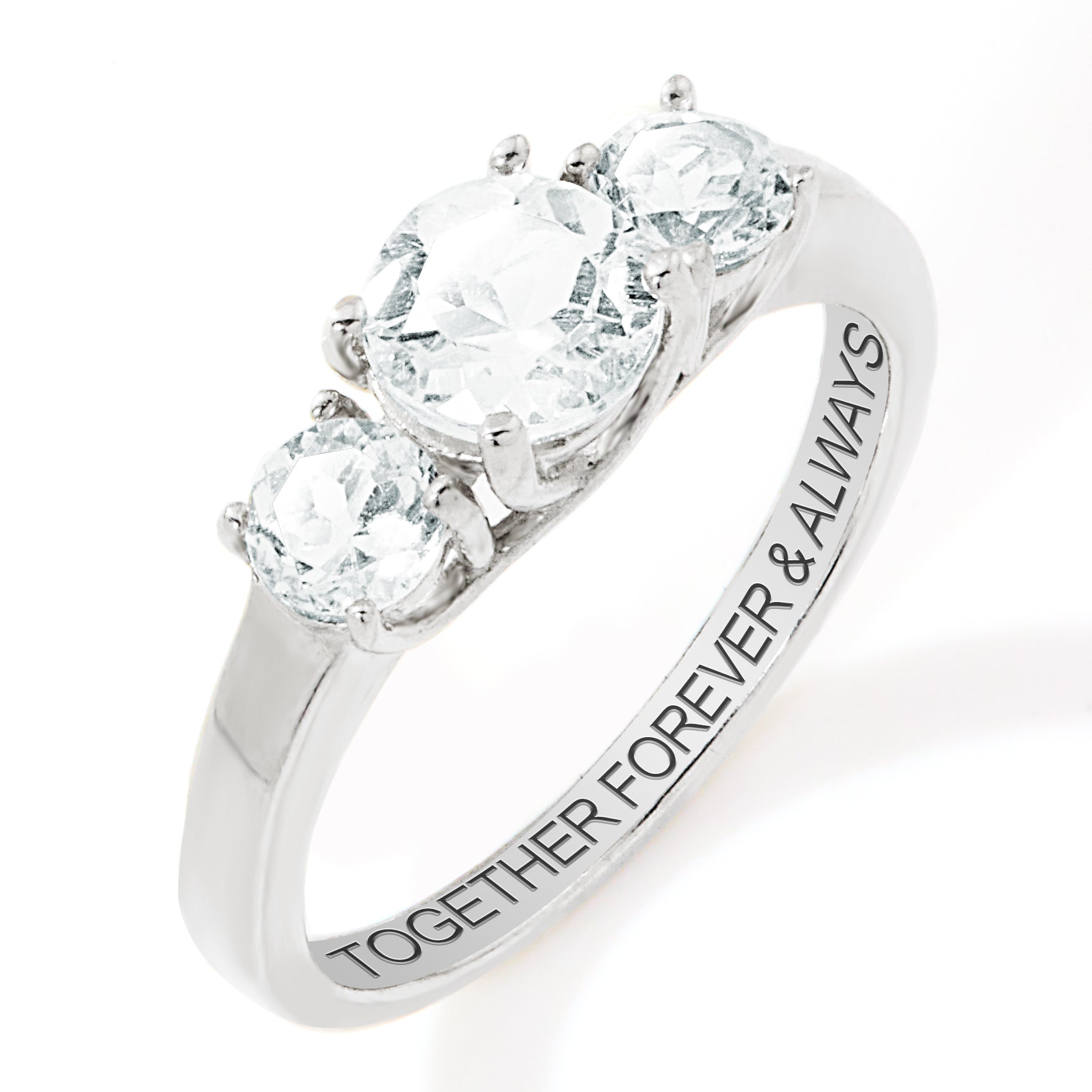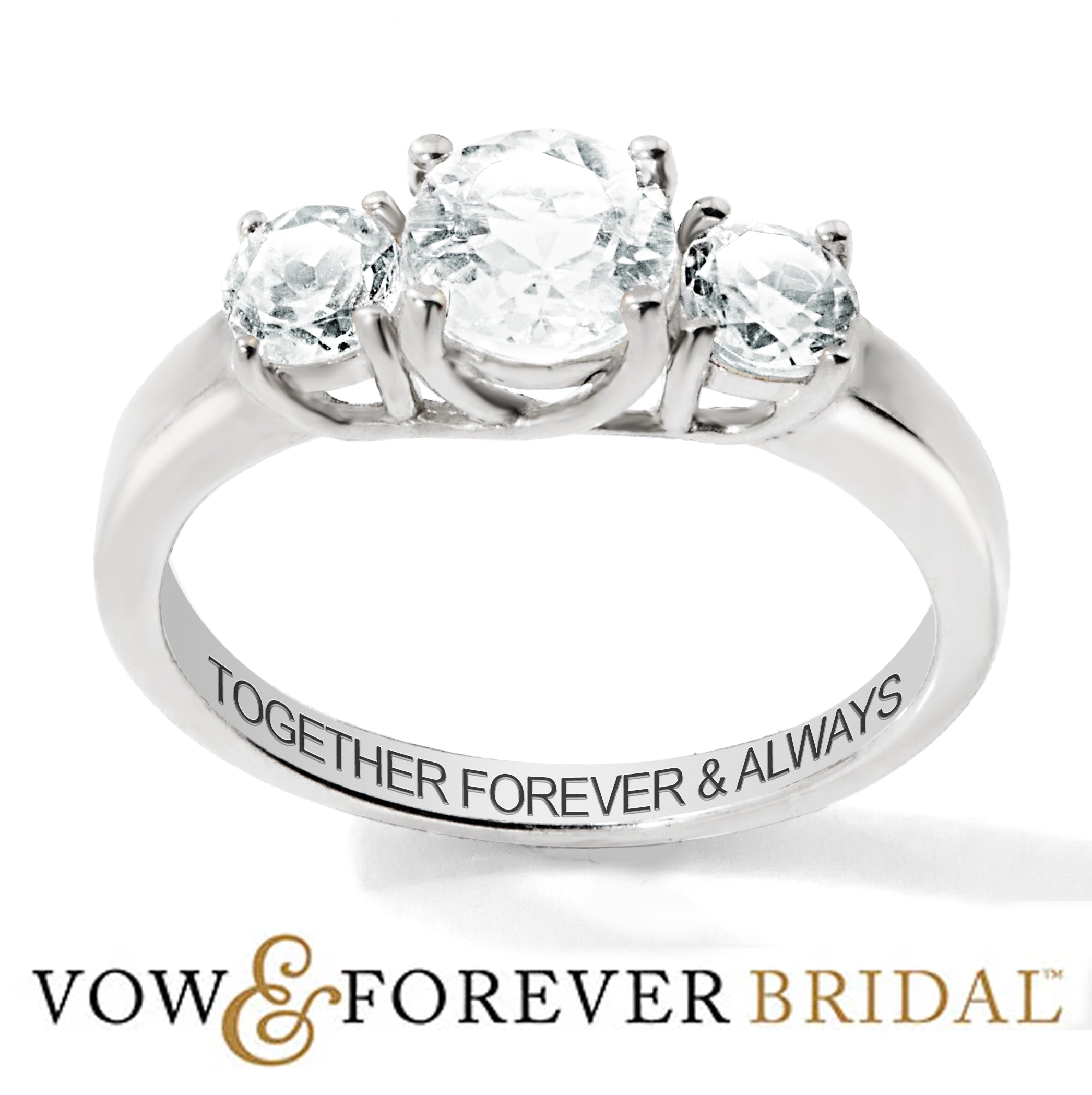 Say "I do" to affordable style with this stunning ring from our Vow and Forever collection! Elegant design features three genuine White Topaz stones set on a Platinum plated band that will shine beautifully on her finger. Add a special engraving along the inside band to create a treasured symbol of your love.