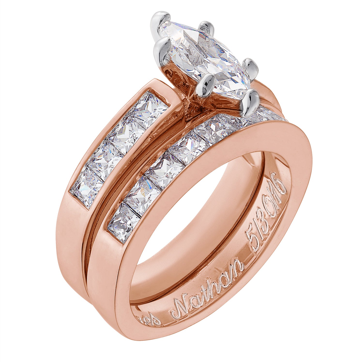 Dazzle her with this unique pair of Rose Gold over Sterling wedding pieces. Included in this 2-piece set is an engagement ring with a CZ crystal and a wedding band that can be engraved with a special message.