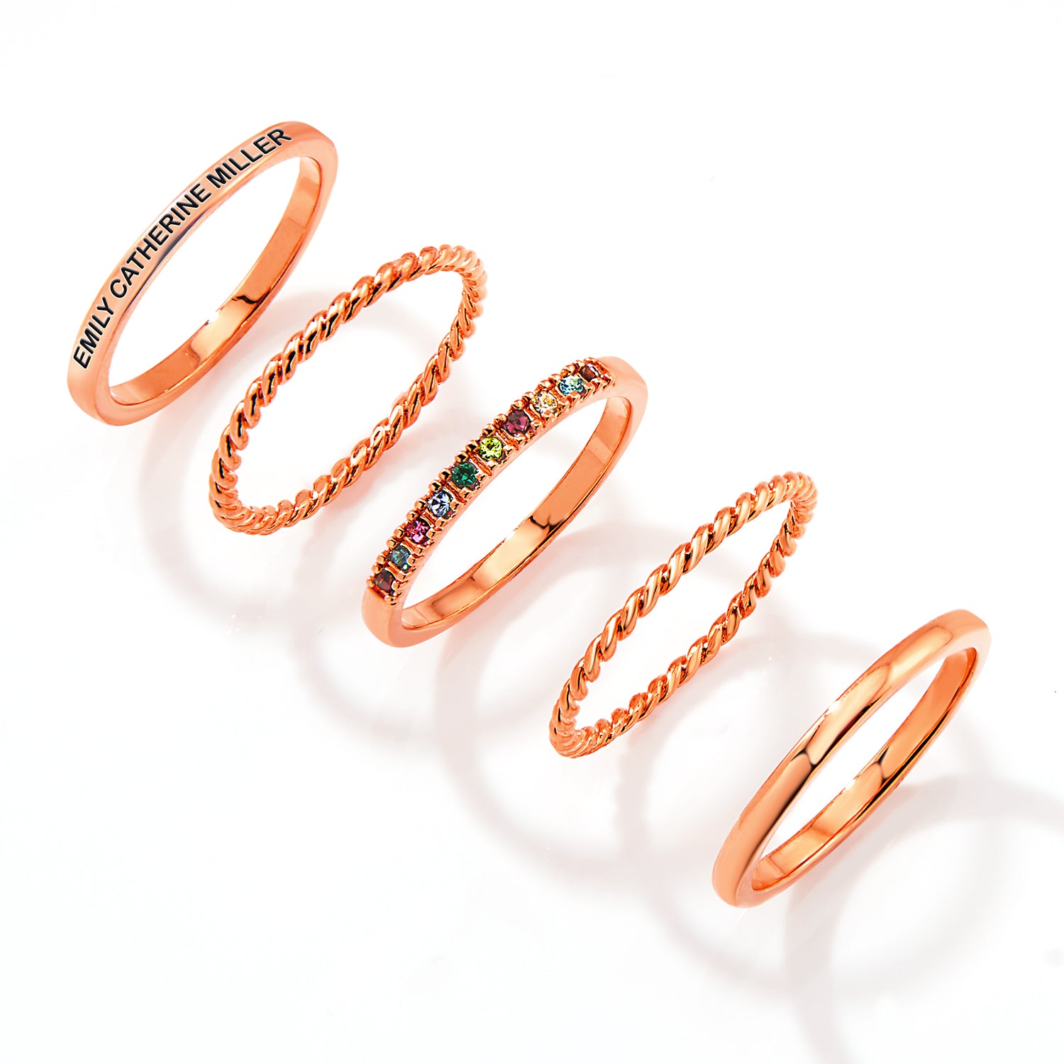 Celebrate the ones who matter most with this Rose Gold Plated Personalized Family Birthstone Stackable Ring Set. The set includes five rose gold plated stackable bands: two sleek high-polished rings (one engraved with up to 22 characters), two delicate roped bands, and a birthstone band featuring up to 10 crystal birthstones—representing family, friends, or special milestones. Stones not selected will appear clear for a balanced, elegant look. Worn together (9.3mm wide) or styled separately, this set is a meaningful and versatile keepsake.