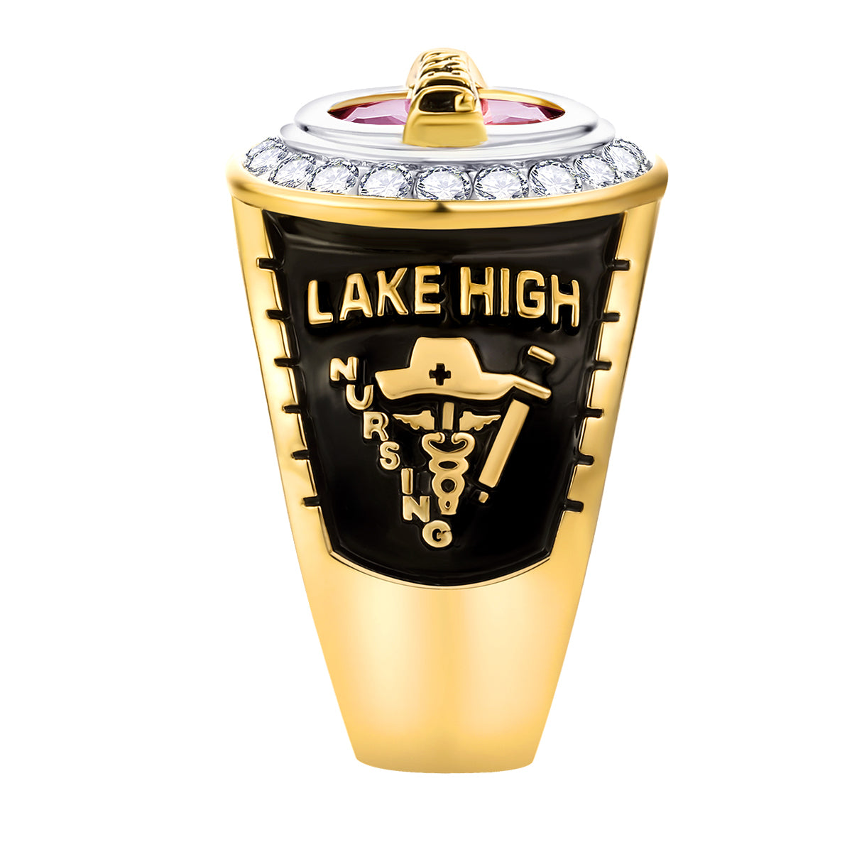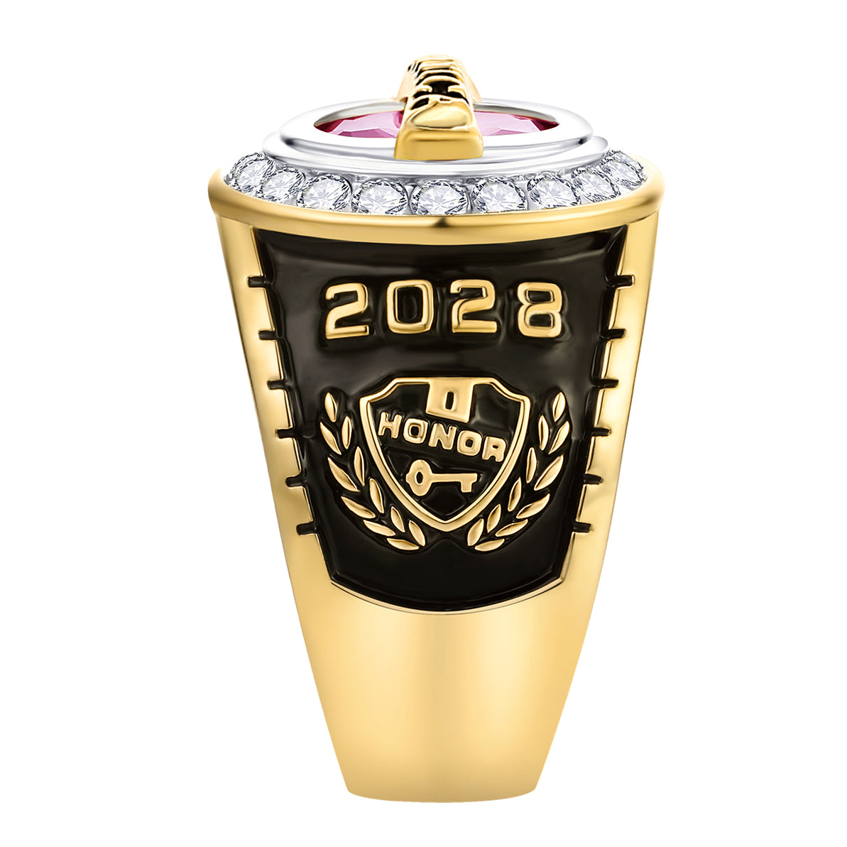 Delight your graduate with her own championship ring! This stunning Gold plated design highlights her school achievements and is topped with her name- covered birthstone. 20 CZ's surround the oval center stone for added sparkle. She'll enjoy wearing this school keepsake for years to come.