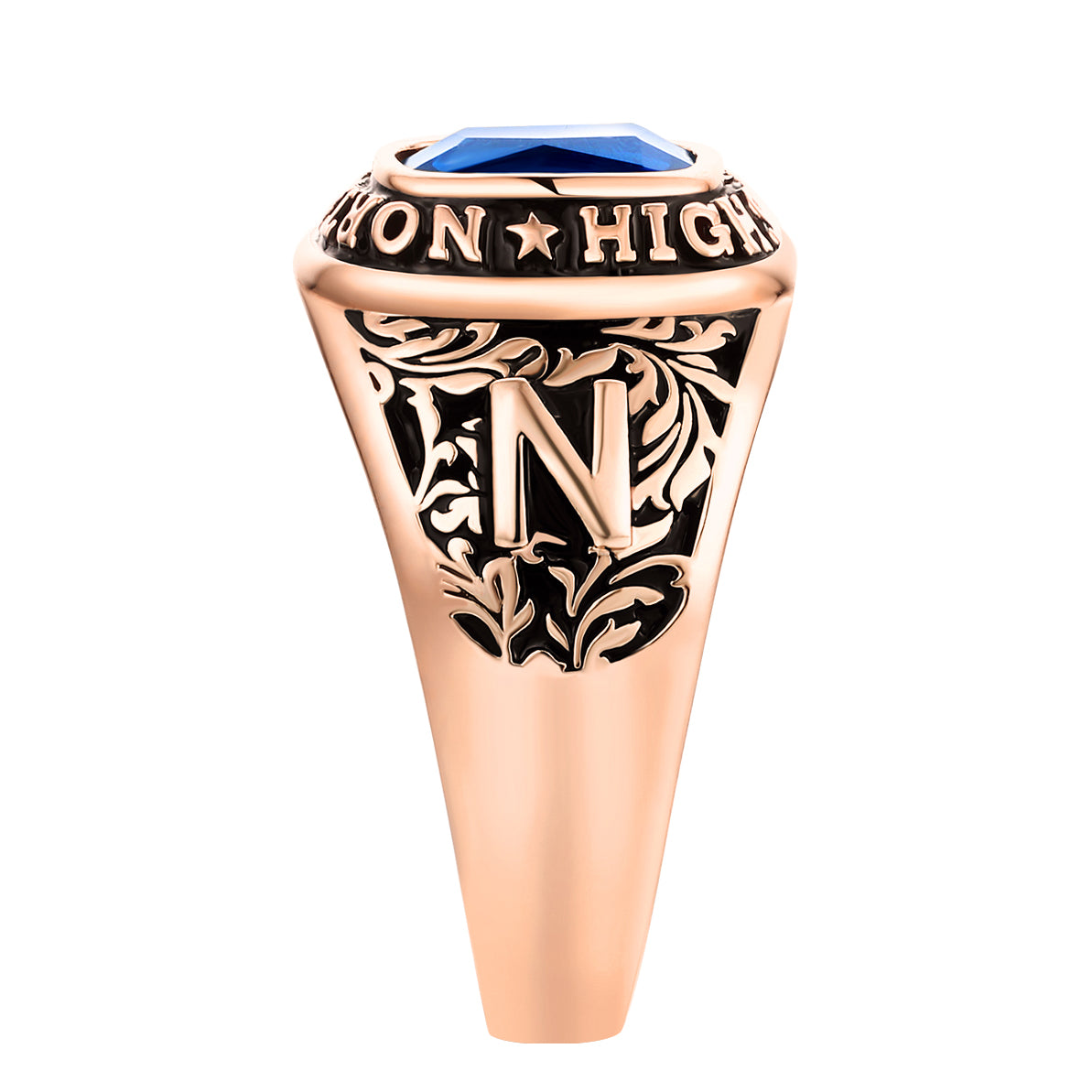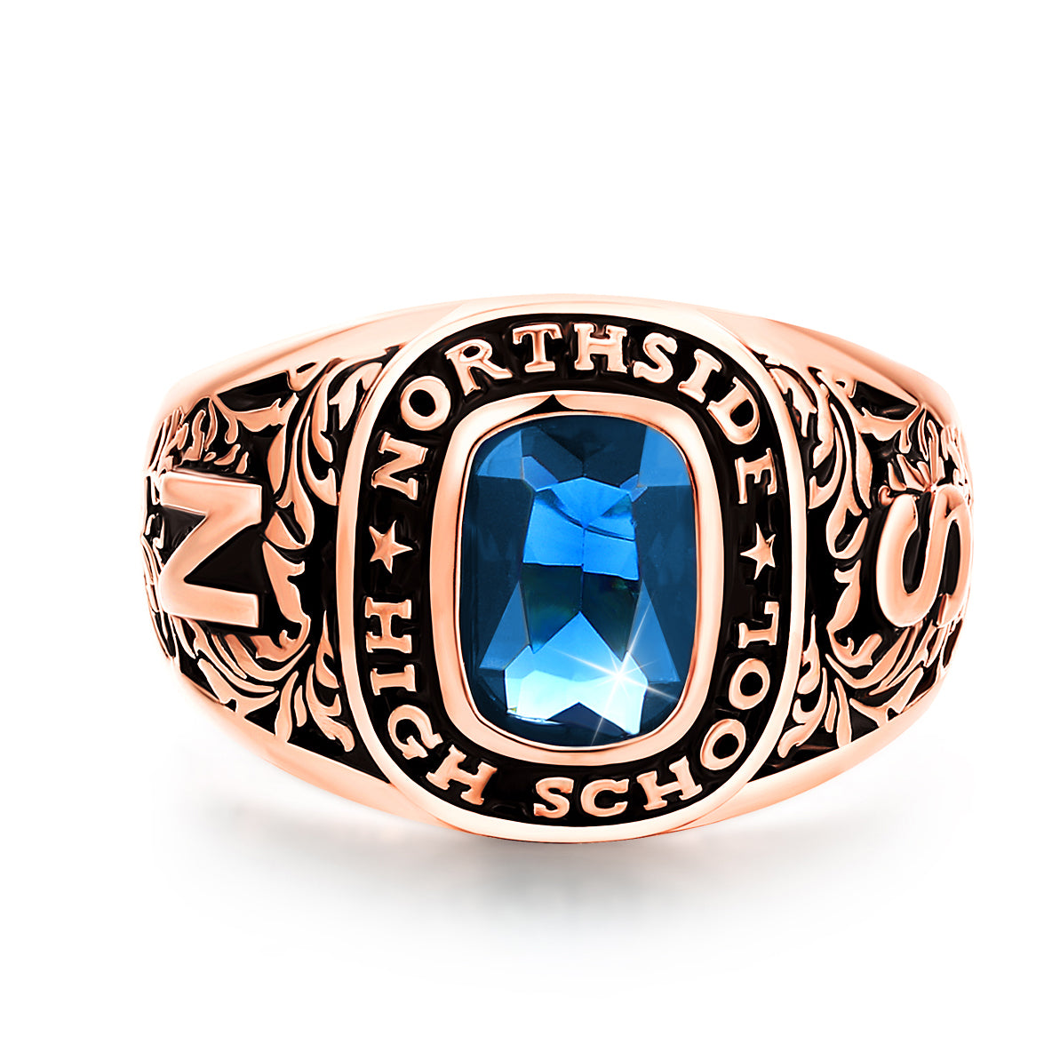 Graduate on top of the class with this stylish school ring! Traditional design showcases a birthstone surrounded by your school name and intricate custom graphics along the sides. Engrave the inside band with a school motto or meaningful quote to complete this Rose Gold plated ring that is all about you!
