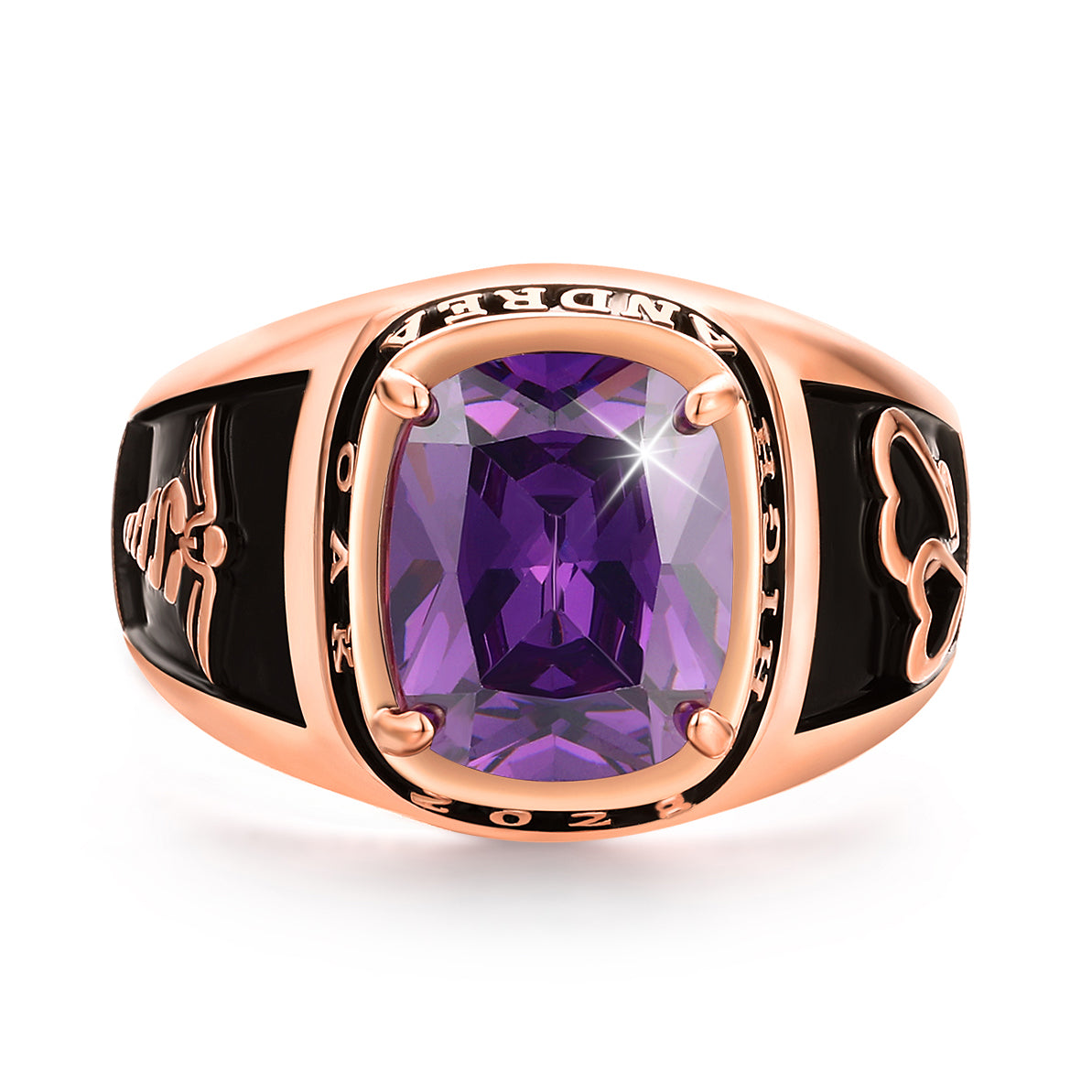 Graduate at the top of fashion with this stylish class ring! This traditional class ring showcases a brilliant prong set birthstone surrounded by your personal stats like school name and graduation date. This Rose Gold plated school ring is sure to be a treasured keepsake that you will wear for years. Makes a spectacular gift for a special graduate.